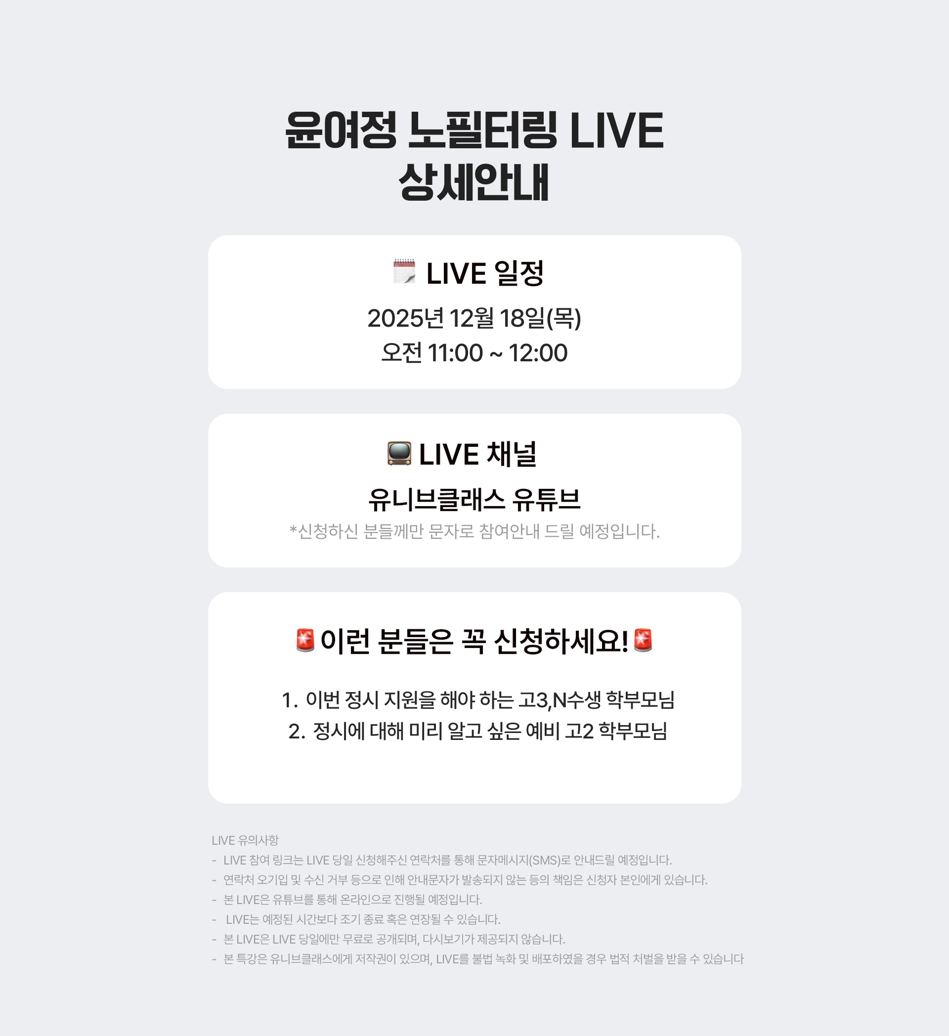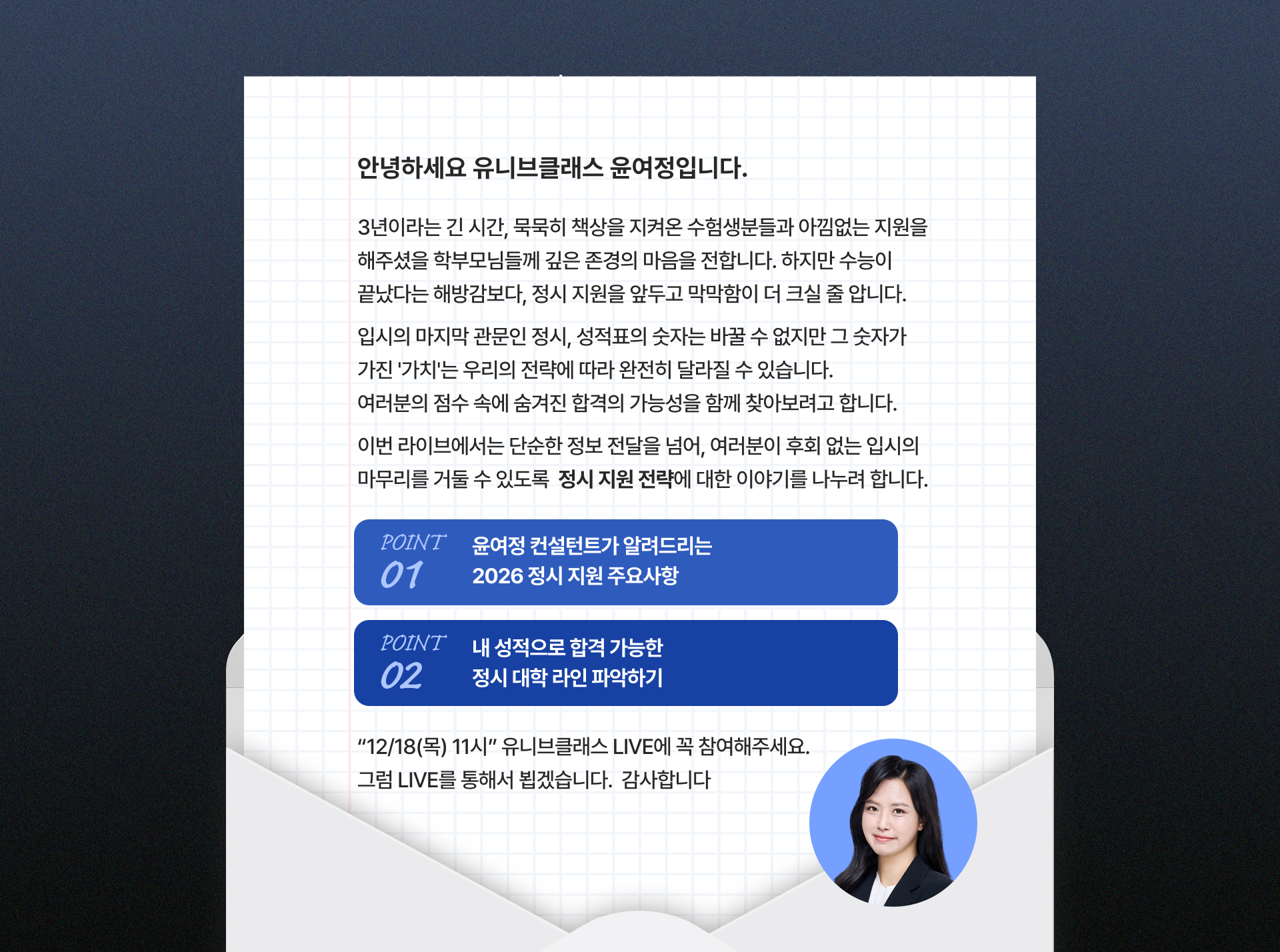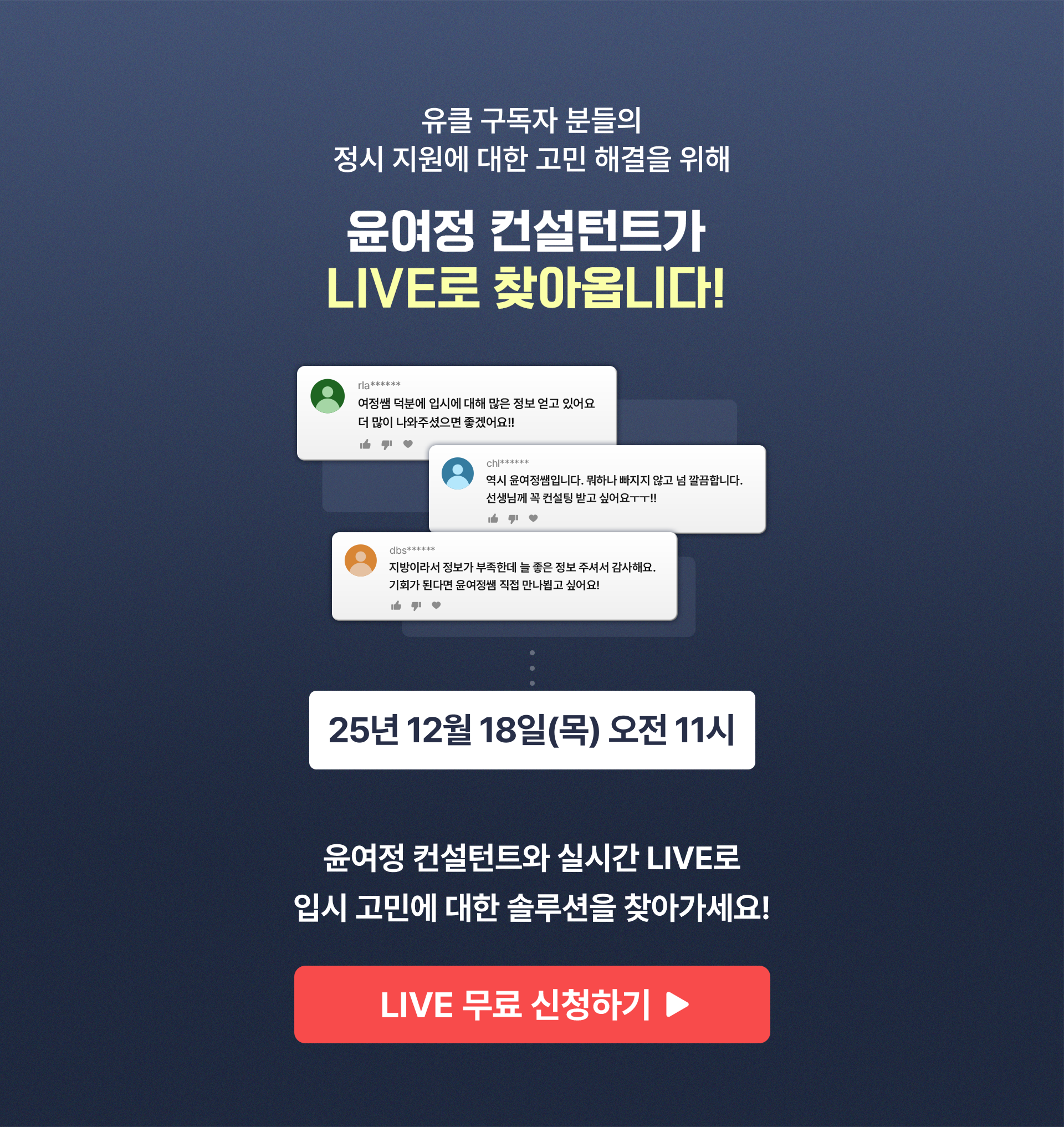 12월 라이브 주제는 바로바로! < 2026 정시 모집 임박! 무조건 1장 이상 합격하는 정시 지원 전략은?> 입니다
