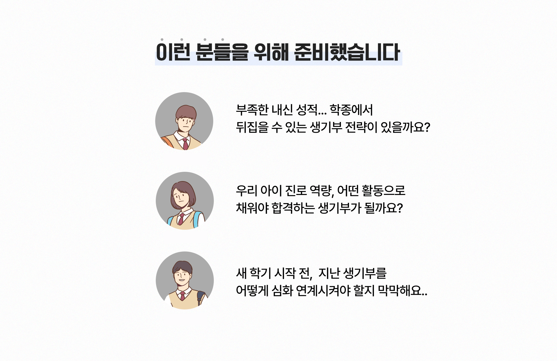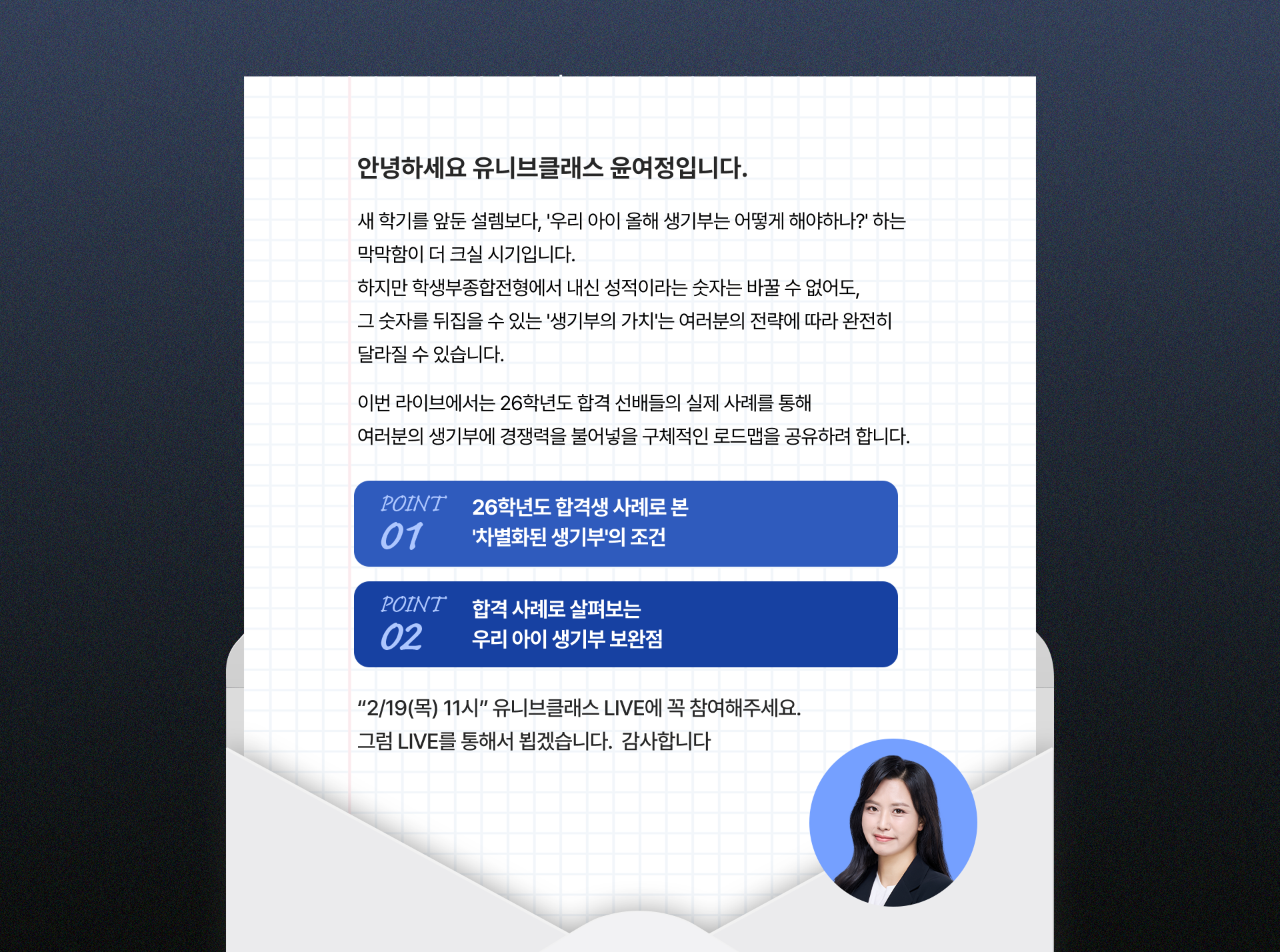 이번 라이브에서는 실제 26학년도 합격생들의 합격 생기부 사례를 톺아보고 학종에서 경쟁력 있는 생기부 작성을 위한 가이드를 알려드리려고 합니다.
