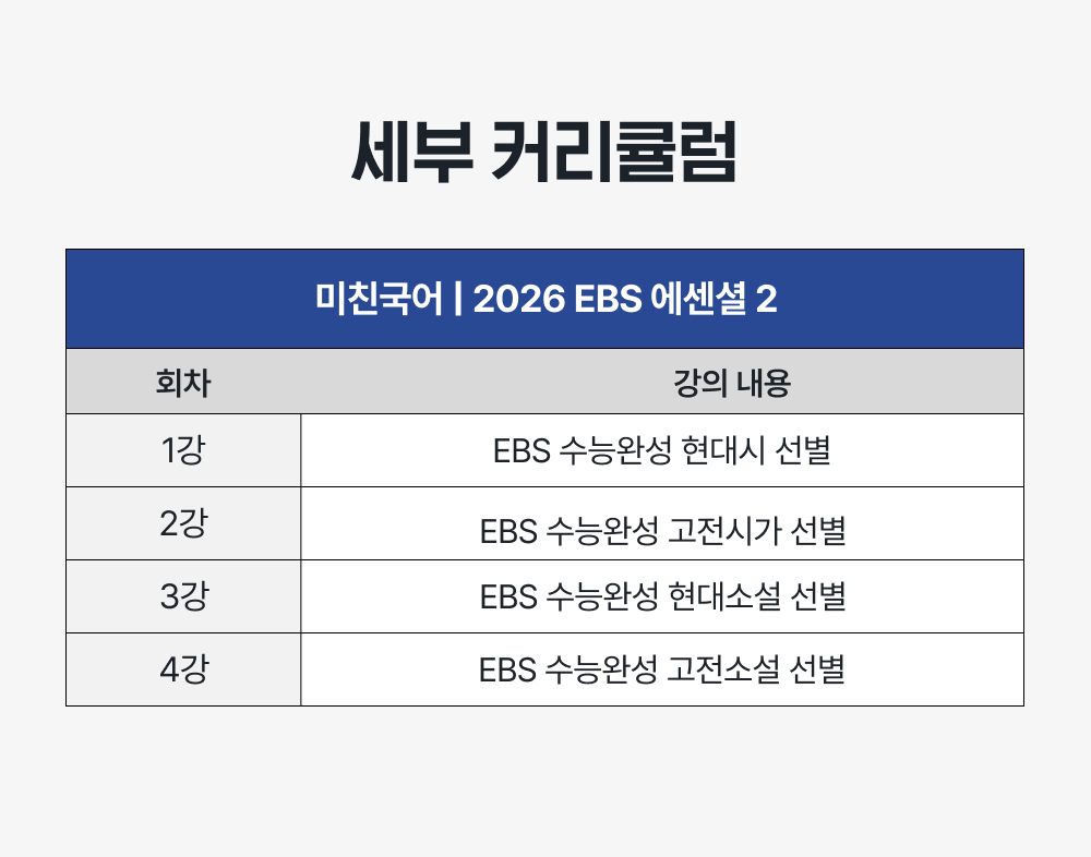 [안내]* 해당 상품은 VOD 강의 상품입니다. 구매와 동시에 강의가 제공되며, 환불은 불가합니다.*해당 커리큘럼은 미친국어 PASS에 포함된 커리큘럼입니다. *2026 수능일까지 무제한 수강 가능합니다. 수능 당일부터 강의가 삭제되며 수강하실 수 없습니다.