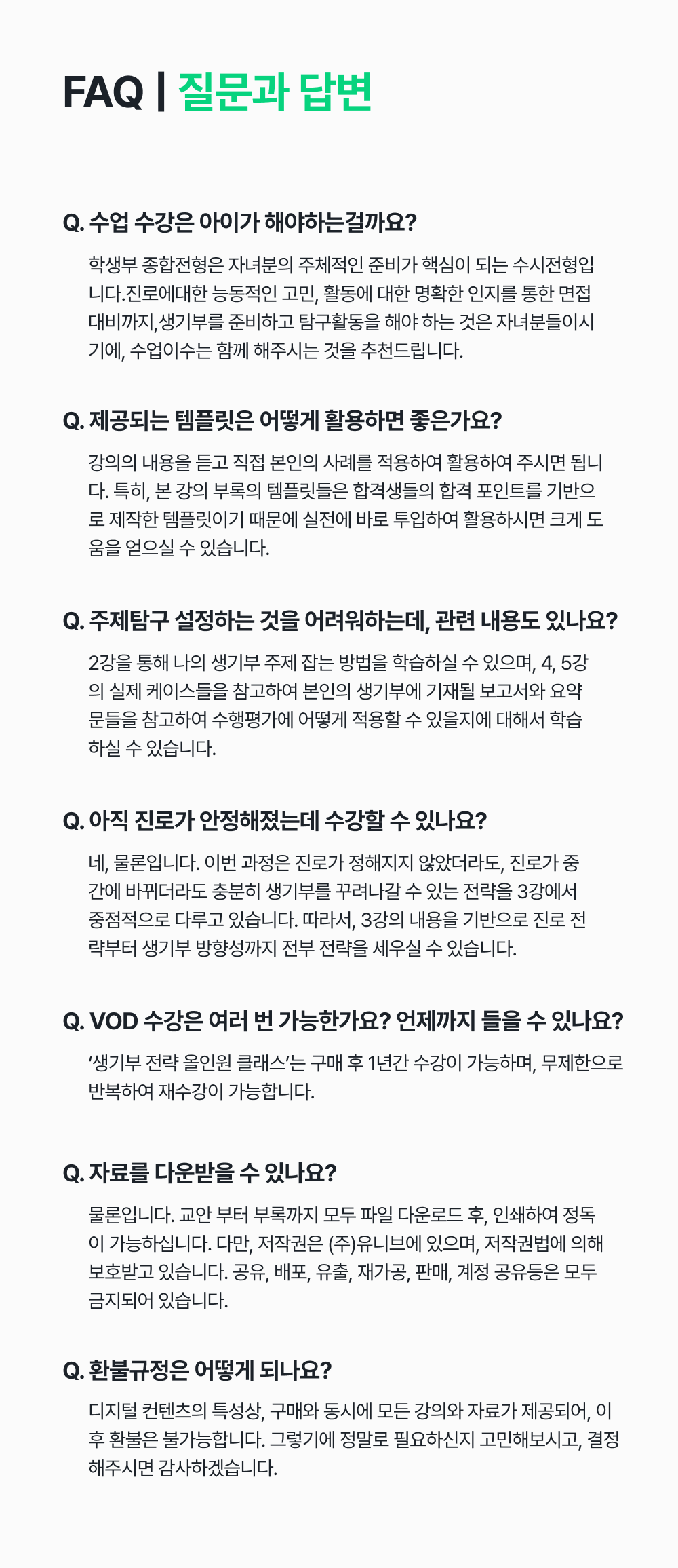 - 환불 요청일 이후 아직 시작되지 않은 기간 단위의 수강료는 전액 환불합니다.