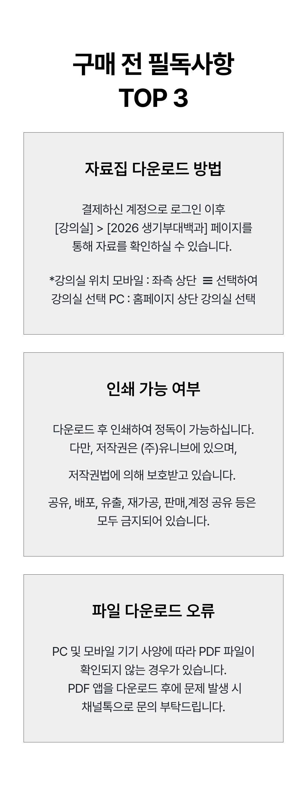 📢 결제 후 자료집 보는 법 📢※ 결제하신 계정으로 로그인 이후 [강의실] > [2026 생기부대백과] 페이지를 통해 자료를 확인하실 수 있습니다.- 모바일 : 좌측 상단 ☰ 선택하여 강의실 선택- PC : 홈페이지 상단 강의실 선택